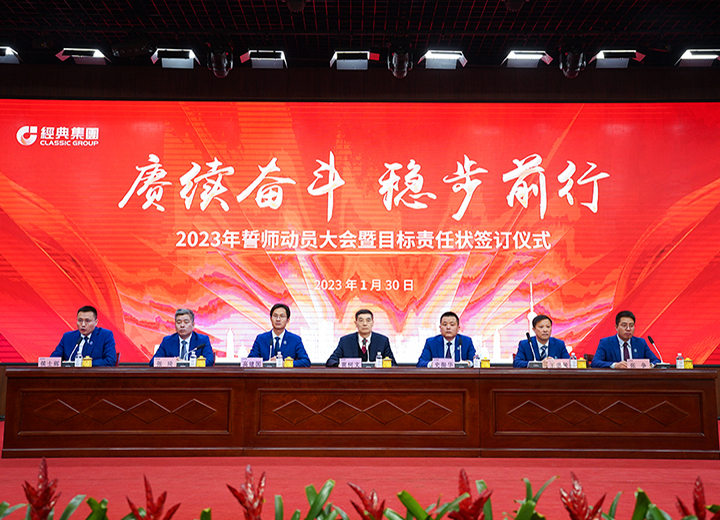 賡續奮斗 穩步前行 經典集團2023年誓師動員大會暨目標責任狀簽訂儀式召開。