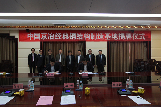揭牌儀式前,中國京冶鋼結構事業部常務副總經理常好誦和經典集團董事長苗樹文在公司三樓會議中心共同簽訂了戰略合作框架協議。中國京冶與經典集團將本著平等、誠信、互惠、共贏的原則,利用各自優勢在鋼結構建筑領域建立長期戰略合作伙伴關系,在高層、超高層鋼結構建筑、大跨度鋼結構建筑、鋼結構住宅產業化、鋼結構工程設計施工制造管理、節能環保維護系統等領域開展項目工程合作、科研與技術合作。