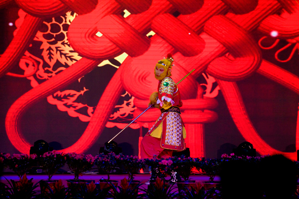文藝演出在舞蹈《金猴鬧春》中拉開了帷幕,表演者把美猴王孫悟空的形象塑造得惟妙惟肖,帶給觀眾猴年新春祝福。魔術(shù)《魔幻世界》、京劇《變臉》、山東快書、李玉剛反串等節(jié)目無不令現(xiàn)場(chǎng)觀眾拍手叫好。舞蹈《綻放》《sugarfree》以優(yōu)美的舞姿、嫻熟的配合跳出了年輕人的活力與激情。歌曲《喜事多》《越來越好》《相親相愛一家人》通過優(yōu)美的旋律,唱出了經(jīng)典人的心聲。來自本山傳媒公司的東北二人轉(zhuǎn)小沈龍團(tuán)隊(duì)的精彩表演成為演出的一大亮點(diǎn),他們通過夸張、幽默、生動(dòng)的表演,贏得了臺(tái)下一陣陣喝彩聲,特別是小沈龍的臺(tái)上臺(tái)下互動(dòng),把歡聲笑語和新年祝福帶給了現(xiàn)場(chǎng)觀眾,將整臺(tái)演出推向了高潮。